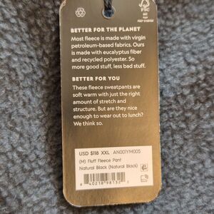New with tag Allbirds Fluff Fleece Pants Natural Black Sherpa Merino Wool Blend. Size XXL please see measurements pictures to be sure of fit. Length: 40in Inseam: 28.5in Retail: $118