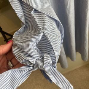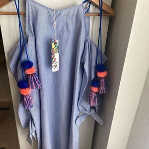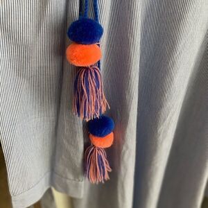 Features: 3/4 length tie sleeves, Blue and white pinstripe Chambray cotton, adjustable tassels with adorable pompom details.