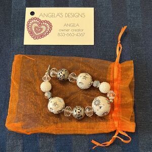 NWT Angelas Designs handmade White silver clear beaded stretch bracelet