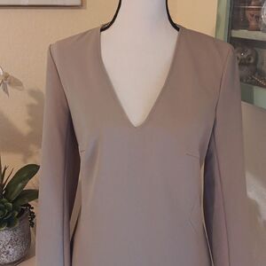 NWT Elegant warm cream beige dress with a striking lace "V" in back by Anna Verdi. Interesting seaming creates a flattering silhouette. Long sleeves. Side zip. Fully lined ( except for lace). Features intricate lace design in a soft cream color. Measures 40 at chest, 33 at waist, 40 at hips, 42 at vented bottom hem. 43.5 long from shoulder to hem. Very sophisticated and chic for your special occasion. Sweet charm included.