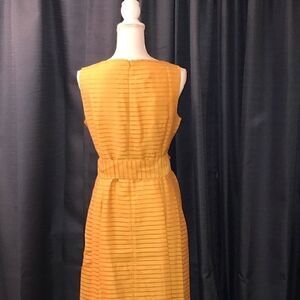Solid sleeveless fit and flare dress featuring a shadow stripe fabrication and waist sash