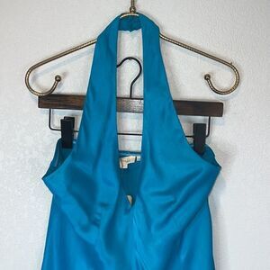 Absolutely gorgeous Marilyn Monroe style turquoise halter dress. Fabric covered buttons at the neck, zip closure. Lined.