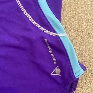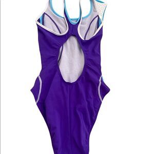 This nwt one piece bathing or swim suit by Aqua Sphere Infinity is called the Ursula. In hues of purple, light blue and white. Razor back with circle backless design. High cut leg. Size xs or size 4 or European 30. Pit to pit is 12