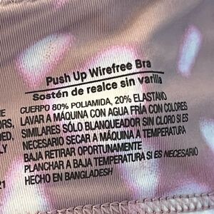 White,pink and lavenderish lightly padded, wireless push up bra. Think elastic adjustable straps. Semi sheer ribbed elastic at the bottom. Super soft material.-