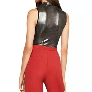 NWT/ BCBG MAXAZRIA/ METALLIC CUT OUT asymmetrical BODYSUIT GUNMETAL(Style ALT14A82 ) Bring shimmer to day or evening, or holiday looks with this sleeveless, metallic bodysuit in tonal striped jersey. Black piping and an asymmetrical cutout make for a bold finish. Pullover tank neck and snap crotch on bodysuit. Measurements are shown;Pit to pit is 13" and shoulder to start of waistline is approximately18' with a few more inches for tuckability. Crotch has grosgrain reinforced snap tape for durability as well as comfort! Excellent condition! (Last picture shows plastic liner still attached inside the crotch area).See all pictures for details and accuracy!