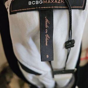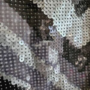 This is a new with tags miniskirt by BCBGMaxAzria. It is the Moonlit style. This skirt has a black waistband and a silver lining. On the back is a zipper with a hidden inner clasp. The skirt has chevron sequins in black, silver, and grey. There are extra sequins attached in the paper envelope. Note some sequins are needing repair as shown in the photos.