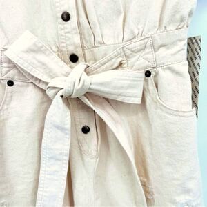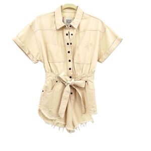 An effortless romper from BDG Urban Outfitters. Distressed Denim Romper. 100% cotton. Utility beige and distressed shorts. It has a belt. Size small. Inseam 1.5” approx, length 29” approx, waist 13” approx. Button down. 6 pockets. New with tag. Excellent condition.