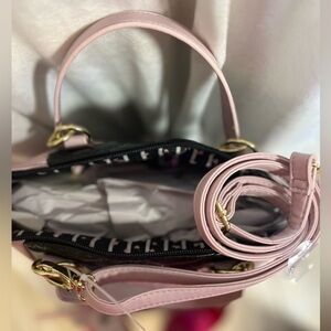 This Betsey Johnson crossbody bag is a stylish addition to any outfit. The bag features a solid pink & black exterior with gold hardware and a quilted finish that matches the wallet/ wristlet perfectly with its quilted pattern. It has a zip closure and zip pockets, measuring 10”W x 9”H, and 5”D.