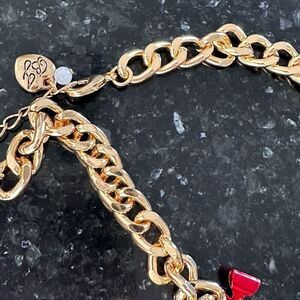 The most adorable pink gingerbread man with pink allover rhinestones and darker pink buttons eyes and mouth. The gold tone chain has two layers, one layer of gemstones that have the look of an iridescent Aurora borealis and two red bow charms at the end of that strand of gems.