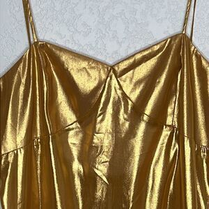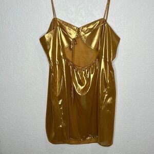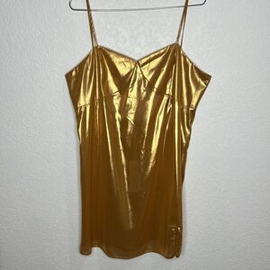 Gorgeous gold metallic slip dress. Pull on, Strappy back. Slightly sheer. Sexy and sultry.