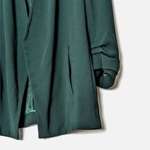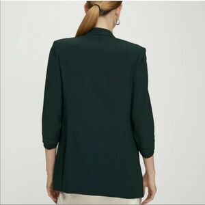 This is an open-front blazer with a shawl collar and ruched sleeves. It’s cut from Mirror Crepe — Babaton’s essential crepe fabric with a soft drape and silky satin back. It’s sourced from an innovative Japanese mill. Cute and casual or easy, modern professional -- this solid dark green blazer does it all.