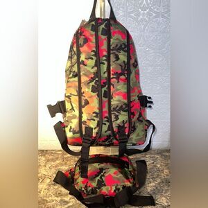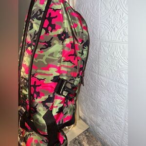 Stylish camouflage backpack perfect for everyday use. Features a vibrant mix of green, pink, and black colors. Ideal for carrying essentials with ease and style.