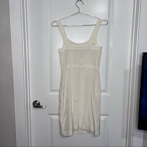 Silk blend sleeveless sheath dress. Fully lined. Hidden side zipper. Embroidered chest detail. Cocktail dress. Minimalist style.