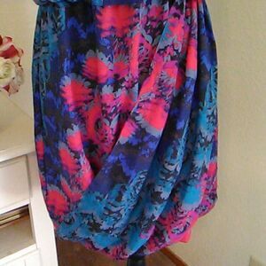 NEW soft, lightweight dress in an abstract floral. Fully lined. Elastic at waist. Keyhole back with buttons. Gathered at round neck. Beautiful drape at front. Balloon hem. Size 6 measures. Size 6 measures 40 at chest. 30-38 at waist. 42 at hips. 34 long from shoulder to hem. The front is unusual and flattering. You'll love this.