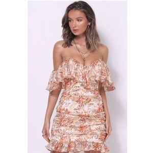 This dress features a mini length, off-the-shoulder sleeves, a sweetheart neckline, ruching in the bodice, ruffles at the hem, a mesh overlay, lining, a centre-back zipper and no stretch.