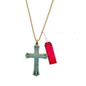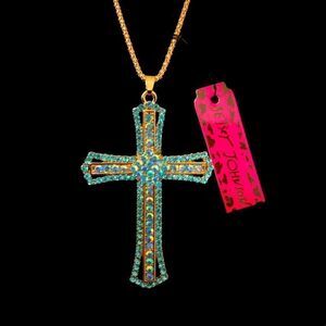 Gorgeous Betsey Johnson turquoise blue rhinestone and gold colored cross necklace with 20 inch adjustable chain. Pictures do not do justice as this cross necklace is just stunning. Dress up that Sunday outfit or any outfit with that beautiful BJ style. Quantities are limited so get yours while they last.