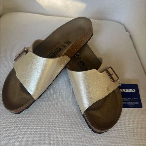 The design of the BIRKENSTOCK Catalina was inspired by the classic Madrid with a strap and metal buckle. The slightly wider strap lends this sandal a modern and elegant appearance. Here, we see the sandal with a silky sheen finish. The upper is made from the skin-friendly, hard-wearing synthetic material Birko-Flor®.