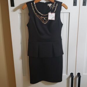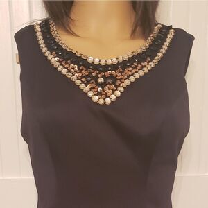 Black and Jeweled Bisou Bisou Formal Pelpum dress in soft black material. Jewels are bronze, white and black.