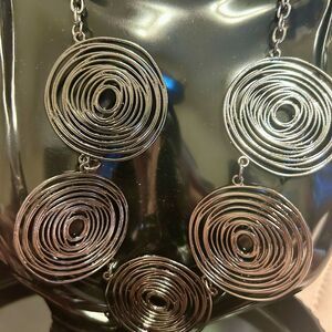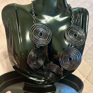 This handcrafted necklace features a striking spiral design, meticulously coiled from black wire to create a modern and artistic look. The unique arrangement of spiral elements adds dimension and visual interest, making it a standout piece in any jewelry collection.