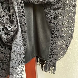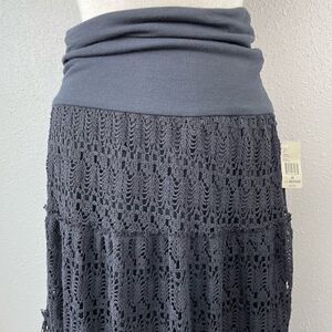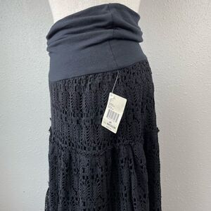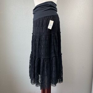 Love this super cute and unique midi skirt by Decoded featuring a crochet black lace design. It measures 14 inches at the stretch fit waist and 32 inches in length.