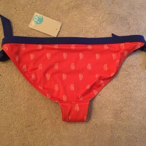 Bright red bikini bottom with blue side ties. Playful pattern adds charm.