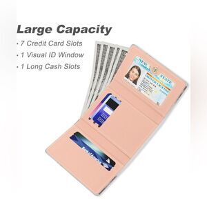 Slim wallet designed with 7 credit card slots, 1 visual ID window and 1 long compartment for cash, folded receipts. Each slot can hold 1 - 2 cards, perfect to holdyour credit card, business card, ID card, metro cards, shopping cards and more. Small size but large capacity, capacity for up to more than 14 credit cards or more than 28 business cards.