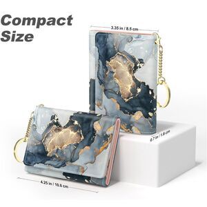 This mini wallet measures 4.25 x 3.35 x 0.7 inch, only 1.8 oz weight, slim, lightweight and does not take space. It is easy to carry by slipping into your front pocket or travel bag. Comes with an extra keyring, works great on a lanyard or bracelet keychain.