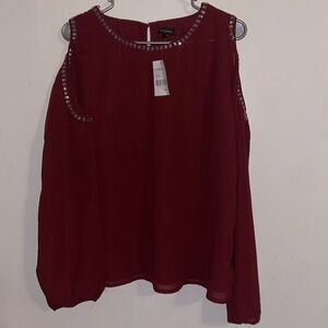Elegant burgundy cold shoulder top with stylish cut-out details. Perfect for a chic and modern look.