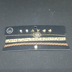 New with tag. Bundle of three necklace and three earrings. One necklace is brown braided, one is leopard print, and one is gold colored.