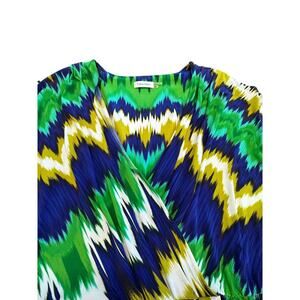 Elevate your wardrobe with the bohemian charm of the Calvin Klein Aztec Sundress. Designed with a vibrant tie-dye pattern, this knee-length dress offers a playful take on the classic hippie aesthetic. The soft blend of polyester and spandex ensures comfort and flexibility, making it perfect for casual outings or your next travel adventure. The dress features a flattering V-neckline and short sleeves, ideal for the warm days of spring and summer. This piece is a plus-size treasure, tailored to fit a size 20. Please note that the belt is missing; however, the dress's distinct style and color will effortlessly stand out in any setting. Care instructions suggest dry cleaning only to maintain its lovely appearance. 41" Top to Bottom x 26.5" Pit to Pit x 17" Shoulder to Shoulder.