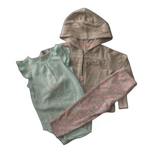 gray zip front hoodie, light green “you & me” onesie, matching leggings, brand new, 12 months