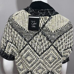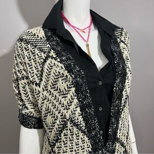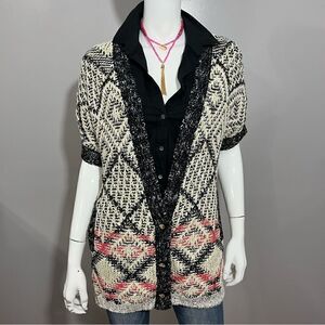 CAbi Carol Anderson by Invitation three button front short sleeve cardigan that is oversized for comfort! Diamond, slightly Aztec print design in pink and black with slight yellow threading. Can be dressed up for work or you can throw on some leggings and a tank for errands! Most versatile cardigan you will own!