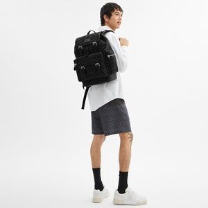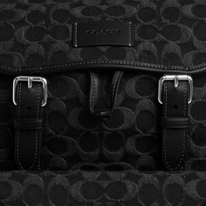Signature denim and smooth calf leather Inside zip cell phone and multifunction pockets Inside tech sleeve Drawstring and snap closures fabric lining Top handle with 3 1/4 drop Outside zip and flap pockets Adjustable shoulder straps Luggage sleeve 11 1/4 (L) x 17 3/4 (H) x 6 1/2 (W) Exclusive of trim this piece is crafted of cotton sourced from farms that use regenerative agricultural practices—those that help to maintain and rejuvenate land increase biological diversity and soil health and could lead to increased carbon absorption Style No. CAJ57