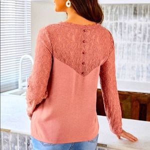 This absolutely gorgeous new boutique top features an elegant design with a gorgeous floral contrast lace on the back and trim of the long sleeves. The back also features charming button detailing lining the lace. The fabric is a non-stretch poly blend and the color is a becoming coral pink.