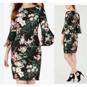 NWT Calvin Klein black with Floral 3/4 Bell Sleeve Sheath Dress