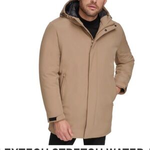 NWT-Calvin Klein-L-tan-zip and snaps, hooded, puffer coat/hooded stadium jacket. double zipper, snaps to close in front. Hood has adjustable bungees. Two front zipper pockets, one inside zip pocket. Adjustable cuffs. Hundred percent polyester. See photos for approximate flat measurements. See photos for more product information. Snow, Cold weather sports.