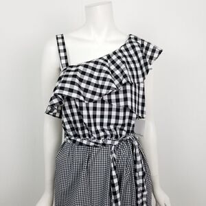 NWT Calvin Klein Womens Black White Gingham Plaid One Shoulder Flounce Dress 8
