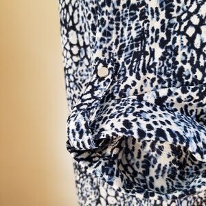 This top features a zip up neckline and 2 functional flap pockets in the front. 3/4 cuffed sleeve secured with a button tab. Tags include an extra button. Hi low hemline.