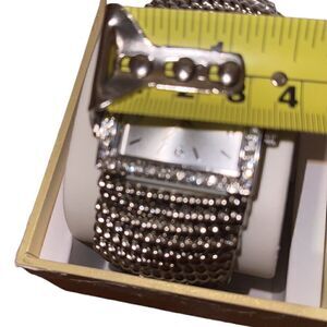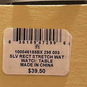 NWT Charter Club silver tone rectangle shaped stretch watch. Batteries included. Red stopper will need to be removed fir the watch to run.