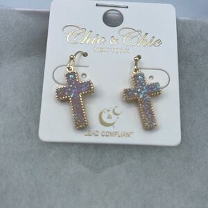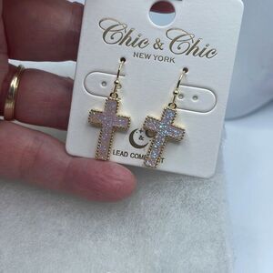 NWT Chic & Chic shimmering druzy quartz cross in opal pink earrings. Gold colored metal . These earrings go from pink to multi & colored white in light.
