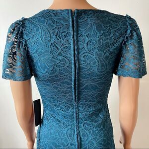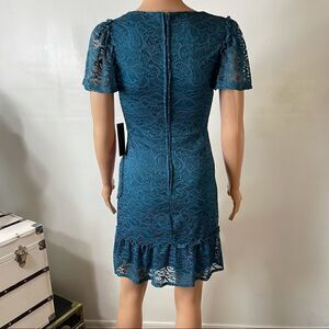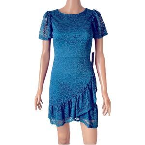 Beautiful and sexy lace dress with bell sleeves and slanting ruffle on skirt hem.