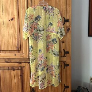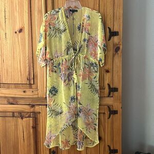 Sheer yellow polyester with metallic threads. Length varies from 36 to 43 inches. Floral pattern with green, peach, and orange. Adjustable tie belt. Pit to pit measure, with the belt tied is 17 inches.