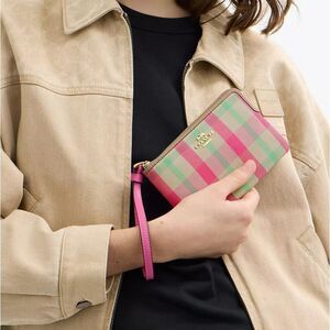 NWT Coach CBP18 Corner Zip Wristlet With Plaid IM/Pink Multi Gold Hardware