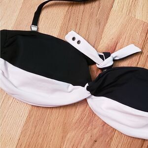New with tags. Molded cup Strapless bikini top with a removable halter strap. Black white fabric twist style with a tie back. My favorite thing about this top are the show lace grommets on the tie back. Nice little Converse detail. Women's size Large