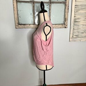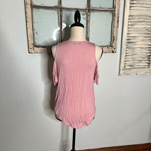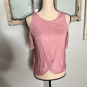 Cute size small could shoulder top with knotted cinched bottom hem. Really pretty soft pink in color and the fabric is lightweight and soft. Perfect casual top for day to day wear or could even be spiced up for a date night or night out with the girls. It’s new with tags and has no known flaws. Slightly wrinkled due to being in storage. Comes from a smoke free home.
