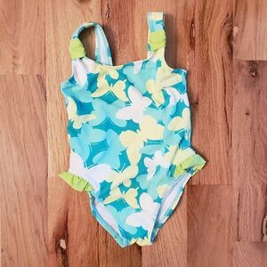 New with tags. Turquoise, aqua, white and celeron green/yellow Butterfly print one piece girls toddler swimsuit. The tag has a bit of of shop wear and is crinkled but the as pictured but it's there and the suit is perfect! Size 2t
