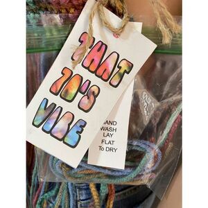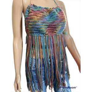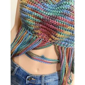 New With Tags, That 70s Vibe Boho Colorful Fringed Crocheted Halter Top, this top has it all the Cool Boho Beachy Vibe! Summer of Love! Tagged M but can be tied to fit L, waist ties are extra long to wrap around waist, see pics for measurements for custom fit.