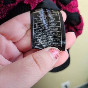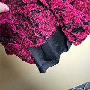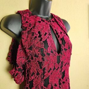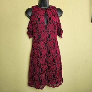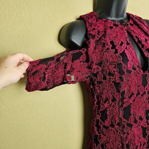 This is a new with tags dress by Cupcakes & Cashmere. It has a solid black lining with a red and black floral lace overlay. There is a keyhole opening on the chest and a zipper on the back with a hidden inner clasp. Note the cold shoulder style sleeves as shown in the photos. On the tag, this dress is listed as beet red.