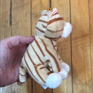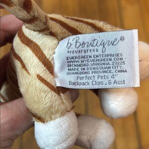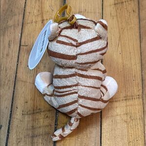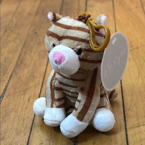Charming plush cat keychain with tan stripes and cream accents. Features a convenient clip for easy attachment.
