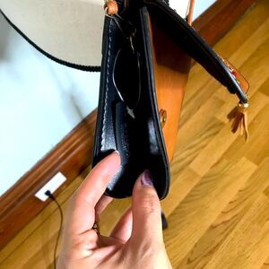 Super cute faux leather boutique brand crossbody purse. Versatile classic brown/cognac color with decorative front flap cutouts. Decorative tassel on the front as well with gold hardware. Long removable shoulder strap to allow for more versatility and to be carried as a clutch. Flap closure fastens with a magnetic clasp securing a generous size open compartment. This bag is super light weight and great for any occasion. It’s new with tags and has no known flaws. Comes from a smoke free home.
